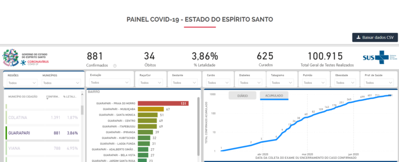 De acordo com as informações apresentadas pelo Painel Covid-19 do Espírito Santo, ligado ao Sistema eSUS/VS – Secretaria de Saúde do Estado (Sesa), Guarapari tem 881 casos confirmados do novo Coronavírus até a atualização deste sábado (27).