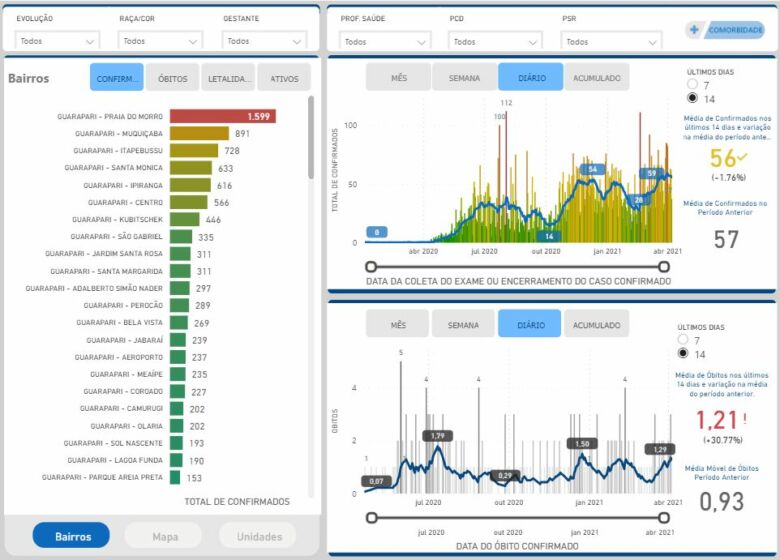 O painel é atualizado diariamente com dados da Secretaria Estadual de Saúde (Sesa) e das secretarias municipais de Saúde. Segundo o documento, Guarapari possui 11.711 casos confirmados e 6.774 casos ainda sob investigação (suspeitos).