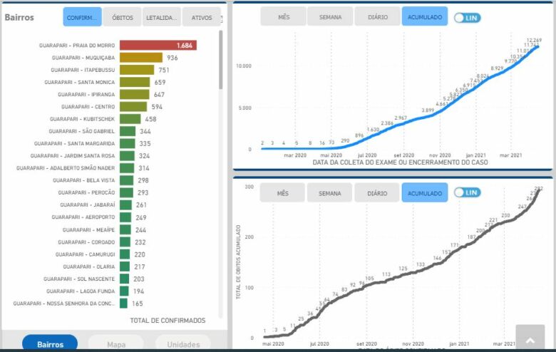 Segundo o Painel, Guarapari possui 12.269 casos confirmados, 292 óbitos e 6.883 casos ainda sob investigação (suspeitos). Até o momento, 11.210 pacientes foram curados da doença no município. A letalidade da doença em Guarapari, segundo o painel, é de 2,4%.