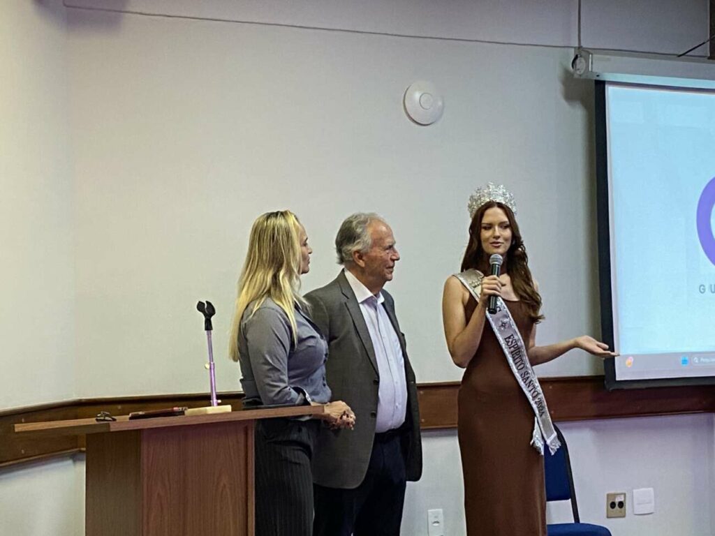 Convidada para abrir o evento e contar sobre sua trajetória vitoriosa até a conquista da coroa do Miss Espírito Santo, Letícia Galvão destacou a importância de compartilhar sua mensagem com os empresários no evento.