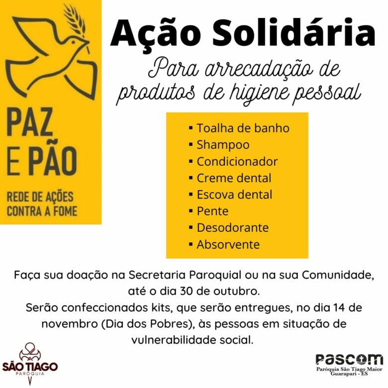 Neste sábado (30), acontece a arrecadação de produtos de higiene que serão doados a pessoas em vulnerabilidade e famílias carentes por meio da campanha Paz e Pão, promovida pela Arquidiocese de Vitória. A campanha está mobilizando todas as paróquias da região Benevente (Guarapari, Anchieta e Alfredo Chaves).