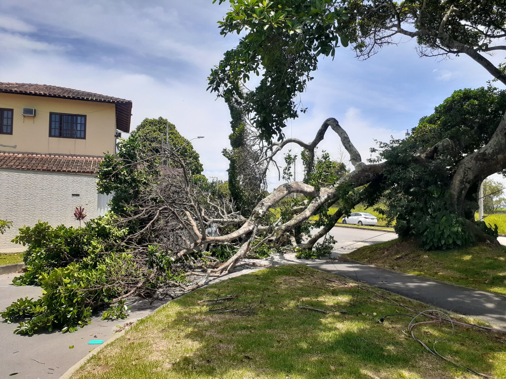 A Defesa Civil chegou, interditou o local, os bombeiros trabalham na remoção dos galhos e a Escelsa já está presente para reparos.