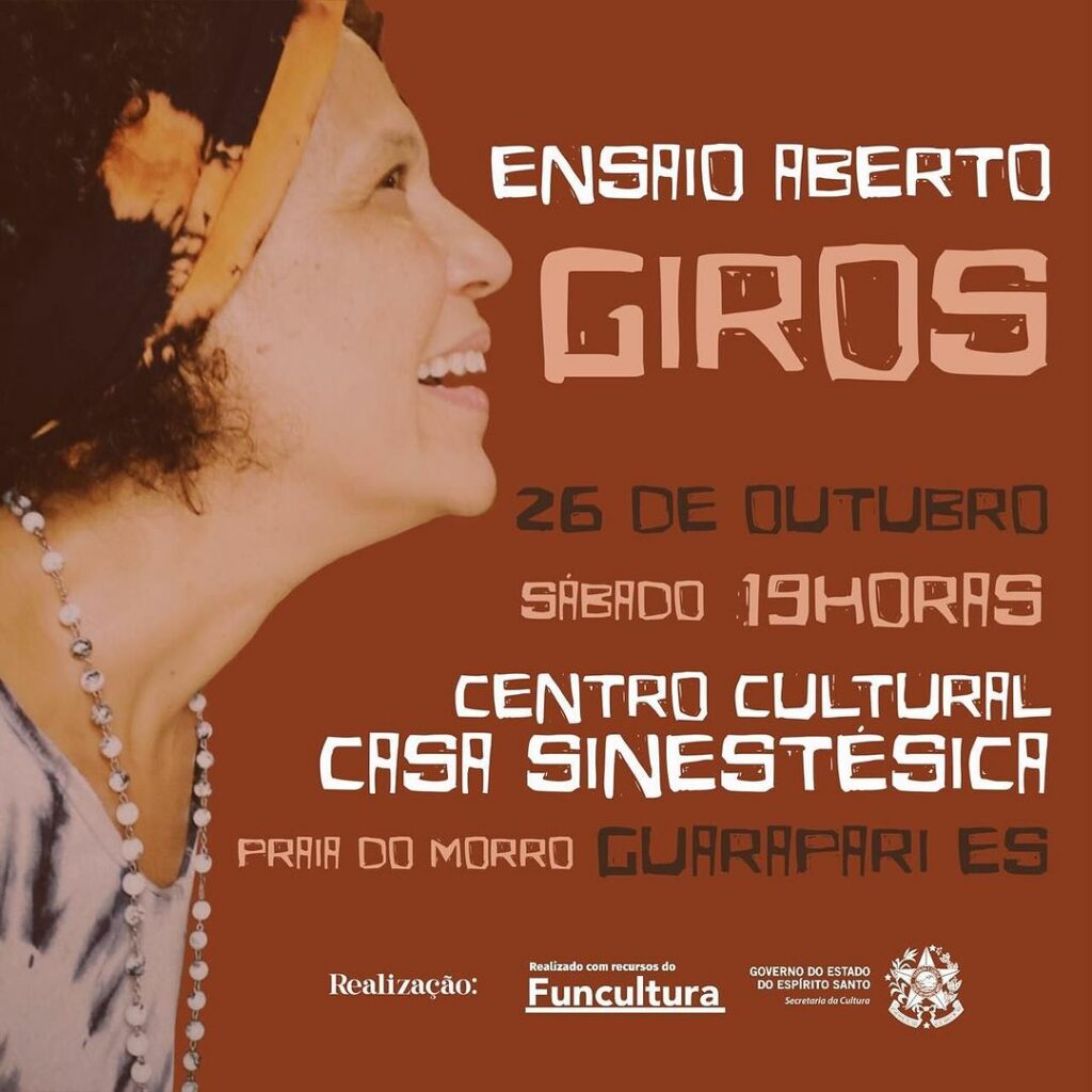 Neste sábado (26), a partir das 19h, o Centro Cultural Casa Sinestésica receberá o ensaio aberto da peça teatral “Giros”. A obra, escrita e protagonizada por Andréa Maria Lobo, é um solo que retrata as memórias de três gerações de mulheres da mesma família, explorando seus deslocamentos entre o Nordeste, Sudeste e Norte do Brasil em busca de melhores condições de vida.