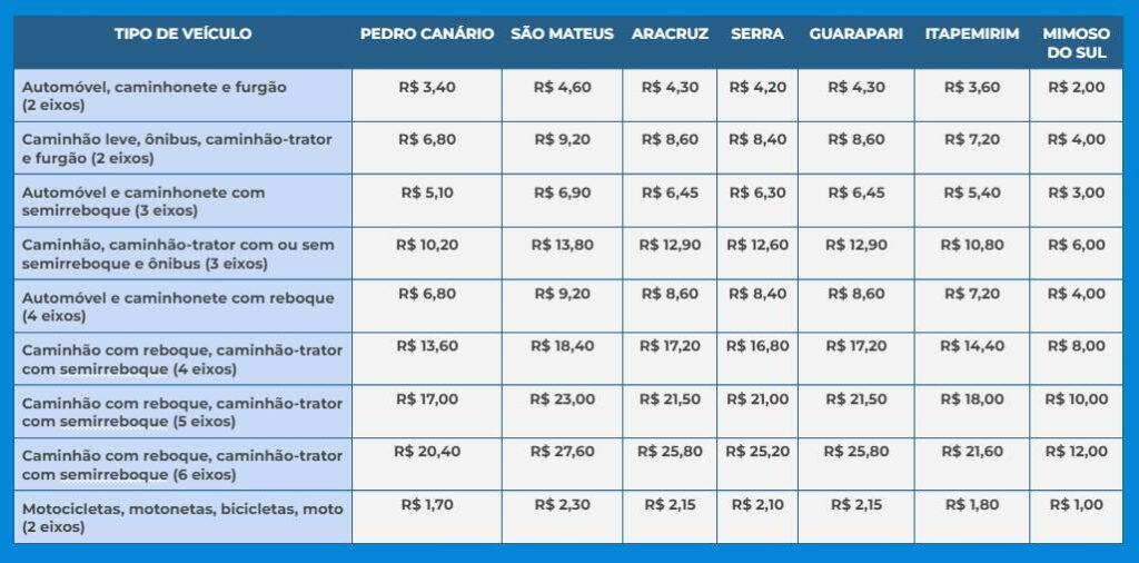 Os pedágios da BR-101, no Espírito Santo, terão novos valores cobrados nas praças de Guarapari, Mimoso do Sul, Itapemirim, Serra, Aracruz, São Mateus e Pedro Canário a partir de amanhã. As tarifas terão redução de 6,69%.