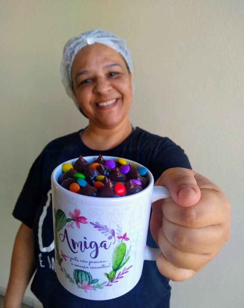 “Estou adicionando aos poucos a confeitaria nos nossos trabalhos, que era minha profissão. O bolo não é assado na caneca, monto dentro dela com camadas de recheio. Tudo é feito por mim, coloco personalidade em cada produto. São detalhes, capricho na hora de fazer os produtos, carinho em tudo mesmo. Entre as empresas de personalizados que tem na cidade, somos os únicos com opções com confeitaria”.