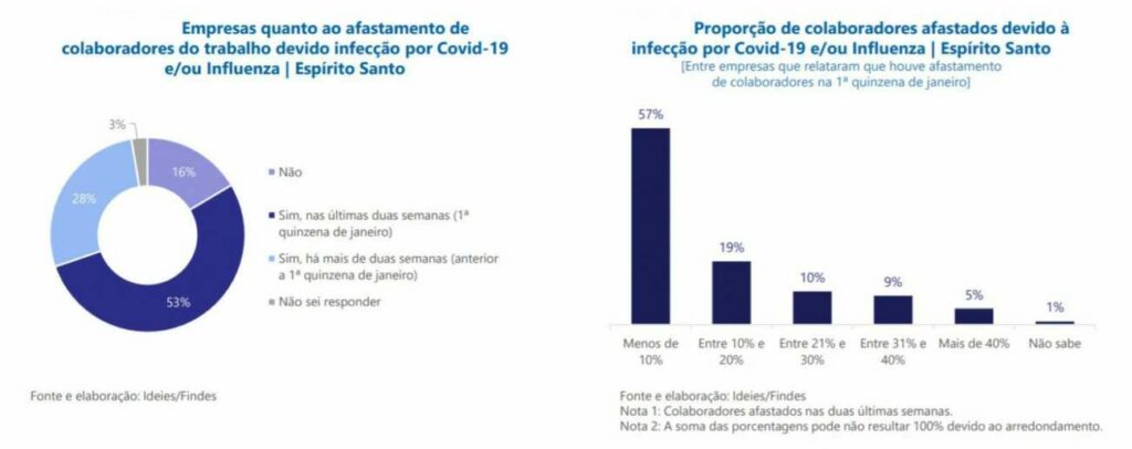 Uma pesquisa inédita, realizada pela Federação das Indústrias do Espírito Santo (Findes), por meio do Instituto de Desenvolvimento Industrial do Espírito Santo (Ideies), revelou que 81% das empresasparticipantes tiveram algum colaborador afastado devido à infecção por coronavírus ou Influenza. Segundo o divulgado pela Findes, os números, resultado da chegada de uma nova variante da Covid-19 (Ômicron) ao país, além de uma nova cepa da gripe, a Darwin (H3N2), mostram reflexos para diferentes segmentos econômicos.