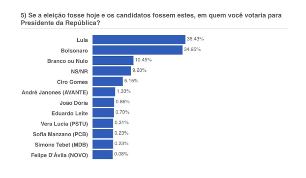 A pesquisa estimulada para Presidente da República aponta que Lula (PT) tem 36,4%, das intenções de voto. Jair Bolsonaro (PL), aparece com 34,95% das intenções de voto. 10,45% dos entrevistados afirmaram ter a intenção de votar branco ou nulo e 9,26% não souberam ou não responderam.