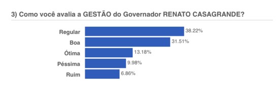 A pesquisa indica que 38,2% dos capixabas consideram a gestão do governador Renato Casagrande regular. 31,5% consideram boa; 13,2% consideram ótima; 10% consideram péssima e 6,7% consideram ruim.