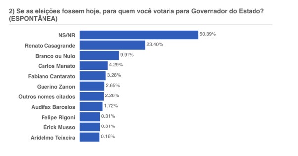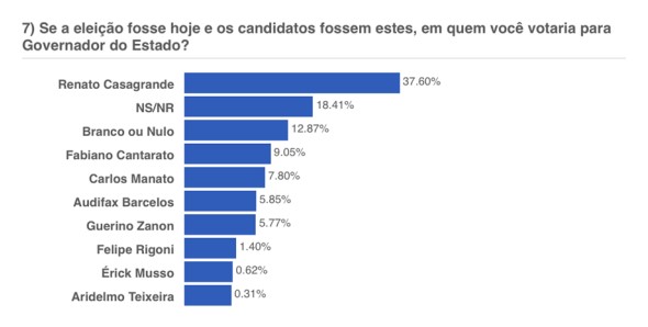 Na pesquisa, Renato Casagrande aparece com 37,6% dos votos na pesquisa estimulada. Em seguida, a pesquisa indica os candidatos que não souberam ou não responderam, com 18,41%; brancos ou nulos, com 12,8% e Fabiano Contarato (PT), com 9% das intenções de voto.