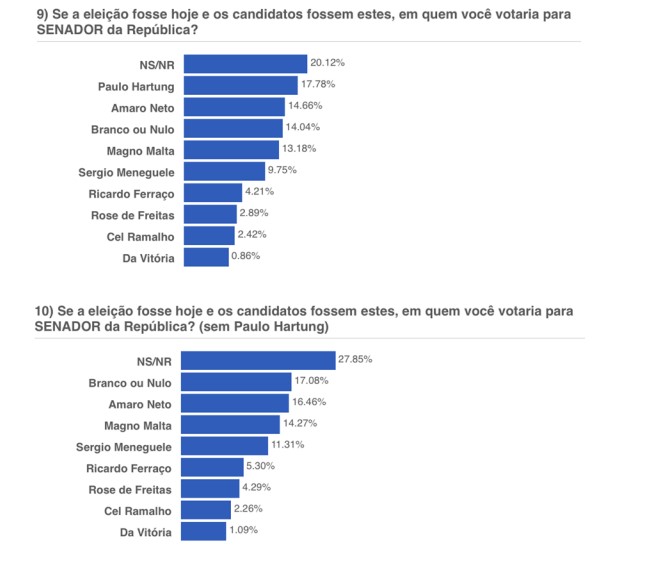 Na eleição para senador da república, em um cenário considerando a candidatura do ex-governador Paulo Hartung, ele aparece como o primeiro nome com 17,78% dos votos, atrás apenas dos entrevistados que não souberam ou não responderam, que somam 20,12%.