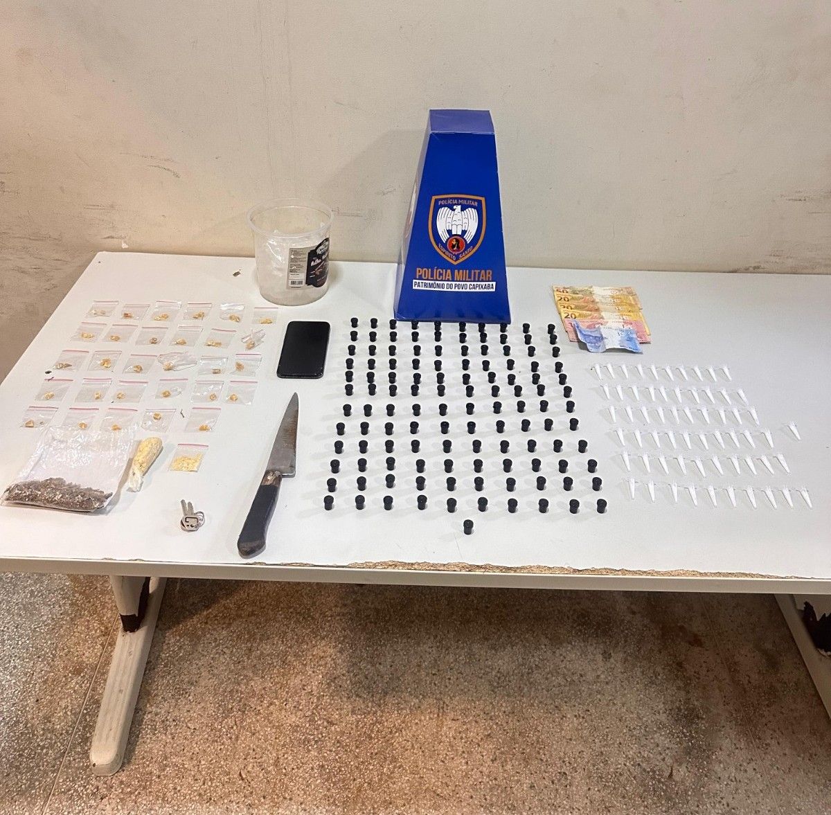 Após informações de que um imóvel estaria sendo utilizado para armazenar drogas por um indivíduo apontado como gerente do tráfico no bairro Nossa Senhora da Conceição, as equipes realizaram uma vigilância nas proximidades da residência. Segundo a polícia, o suspeito foi abordado ao sair do local com um volume nas mãos. Durante a busca pessoal, foram encontradas 28 pedras de crack e R$ 122,00 em dinheiro.