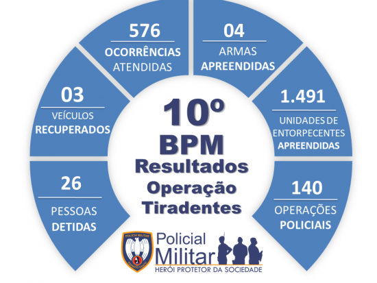 Hoje (23), a 10º Batalhão da Polícia Militar divulgou os números da Operação Tiradentes. O estudo pontua os números operacionais da Unidade durante o período de 17 a 22 de Abril no município de Guarapari.