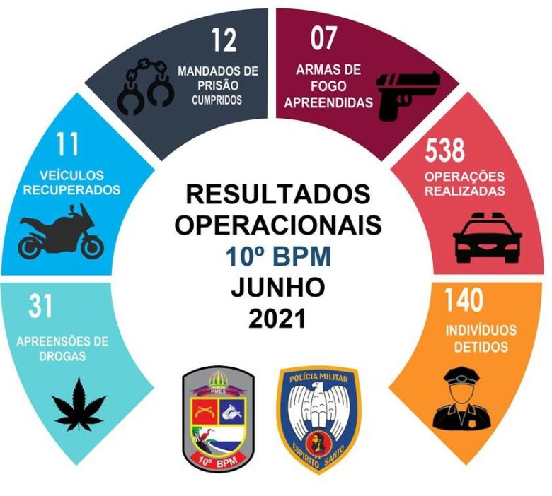 Vários índices de produtividade apresentaram um considerável aumento, resultado do trabalho contínuo da PM. Ocorrências como: apreensão de armas de fogo (7), veículos recuperados (11), mandados de prisão cumpridos (12), apreensão de drogas (31), tiveram aumento em relação ao mês anterior (maio/2021). Apenas em um mês, 538 operações foram realizadas e 140 pessoas foram detidas em ocorrências diversas.