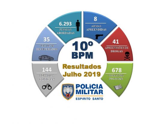 Na semana passada, a Polícia Militar em Guarapari divulgou os resultados das 678 operações realizadas no mês de julho. No total, oito armas de fogo foram retiradas das ruas, 144 pessoas detidas, 35 veículos recuperados e 41 apreensões de drogas,