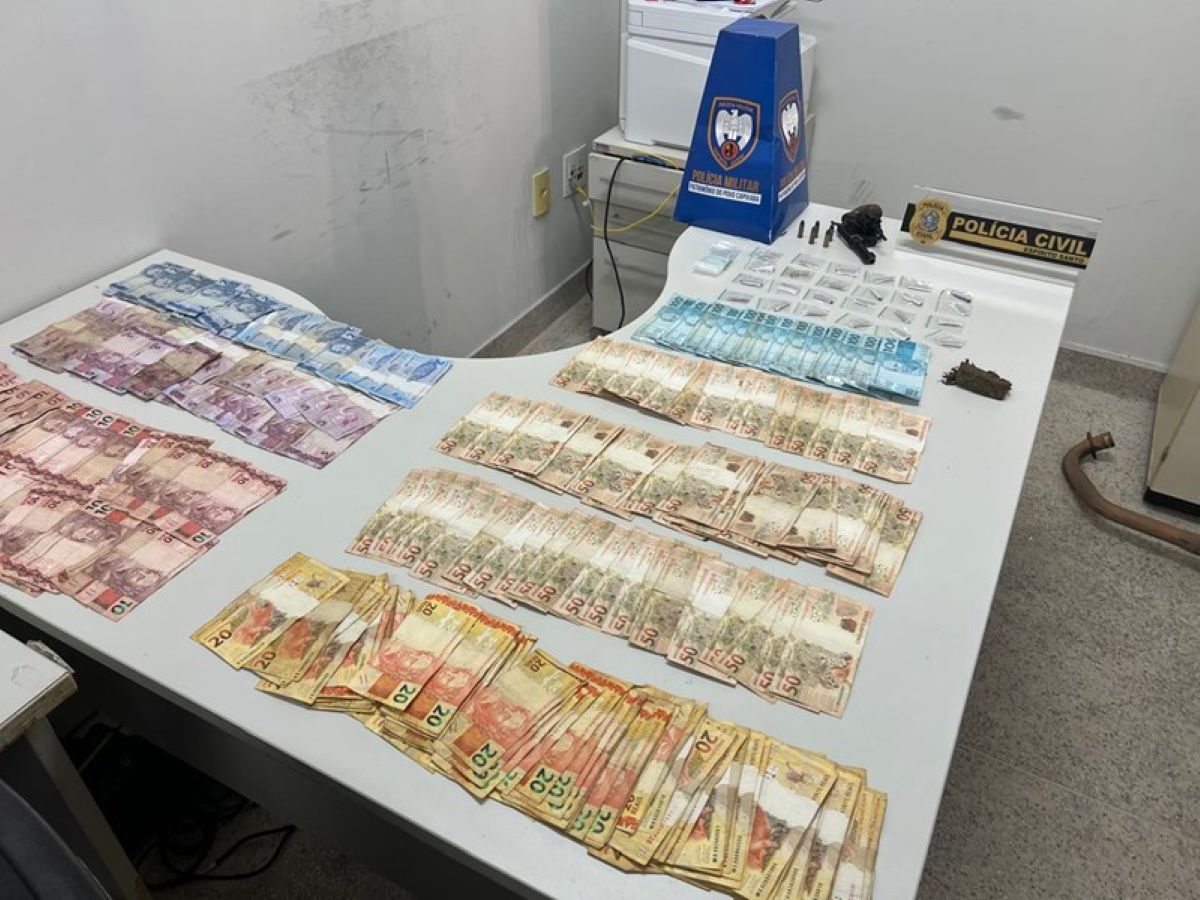 Durante o cumprimento de mandados de busca e apreensão, um indivíduo foi detido por adulteração de veículo automotor e outro por tráfico de drogas e porte ilegal de arma de fogo. No local, os agentes apreenderam uma arma de fogo calibre .32 com cinco munições, 24 papelotes de maconha, uma porção de haxixe, sete veículos — entre carros e motos — com restrições administrativas, além de R$ 7,5 mil em espécie.