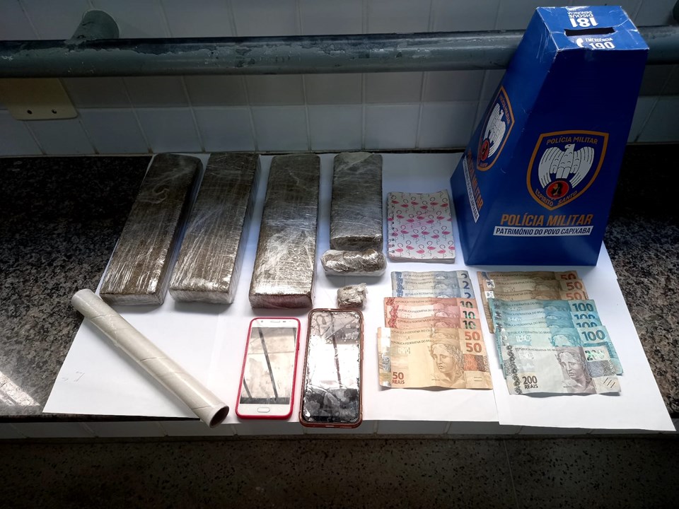 Ainda durante a operação, equipes foram ao bairro Santa Margarida, em Guarapari, e deram cumprimento a um mandado de busca e apreensão contra um indivíduo de 24 anos. Na residência dele, foram apreendidos três tabletes de maconha de 800 gramas cada, um tablete de maconha de 400 gramas, um tablete de maconha de 150 gramas, uma bucha de maconha, um caderno de anotações do tráfico de drogas, material para embalo de entorpecentes, R$ 886,00 em espécie.