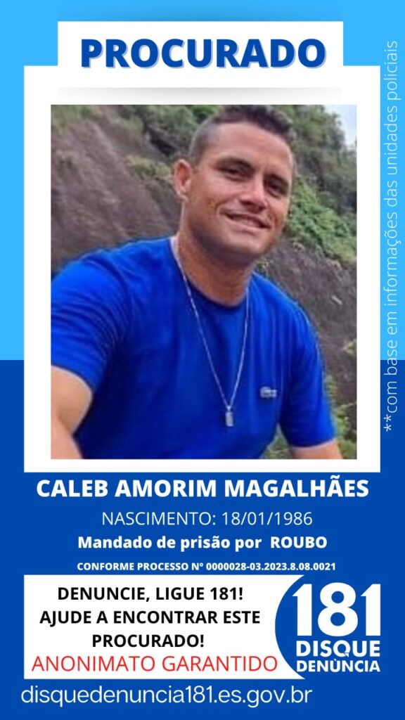 A Delegacia Regional de Guarapari divulgou nessa terça (10) a foto de um homem procurado por praticar roubos na cidade. Caleb Amorim Magalhães possui mandado de prisão expedido pela Justiça.