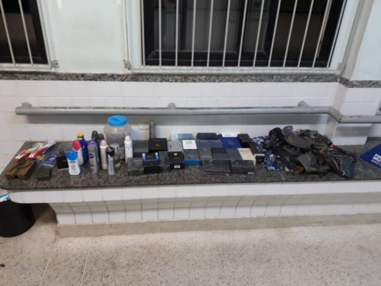 Também foi encontrado no local materiais para embalo de drogas, como pinos vazios, uma porção grande de maconha, um pino de cocaína e uma munição 380. Com base na verificação de ocorrências, os policias verificaram que havia objetos de outros furtos no galpão.