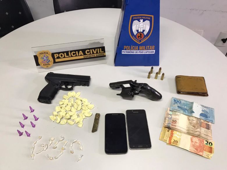 Durante Operação Sentinela, realizada no Recanto do Sol, em Anchieta, pela 10ª Companhia Independente da Polícia Militar, 10ª Delegacia Regional de Anchieta e a K9 do 10° Batalhão da Polícia Militar, foram cumpridos 2 mandados de busca e apreensão e 1 mandado de prisão. Onde foi logrado êxito na detenção de 2 indivíduos com os seguintes materiais: 1 revólver .38, 5 munições .38, 1 simulacro de pistola, 7 pinos de cocaína, 1 pedaço de maconha, R$790,00 em espécie, 37 papelotes de cocaína, 24 pedras de crack e 2 celulares. Vale ressaltar que o alvo com mandado de prisão não foi localizado. Os detidos foram autuados em flagrante delito.