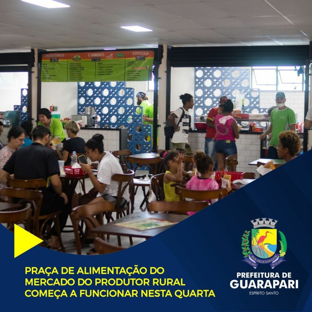 A praça de alimentação do Mercado do Produtor Rural de Guarapari começou a funcionar nesta quarta-feira (23). Com solenidade de inauguração realizada em dezembro do ano passado e o primeiro dia de feira no início do mês de março, a praça de alimentação do local seguia em obras nos dois eventos anteriores.