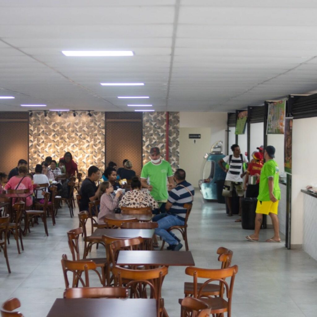 Posicionado como um mezanino no segundo andar do Mercado do Produtor Rural de Guarapari, a Praça de Alimentação do local propõe um espaço com a disponibilidade de produtos da agricultura familiar, cervejas artesanais e os tradicionais pastel e caldo de cana da feira. Entretanto, o local ainda estava sem as portas portas dos boxes, que se encontravam em instalação no primeiro dia de feira.