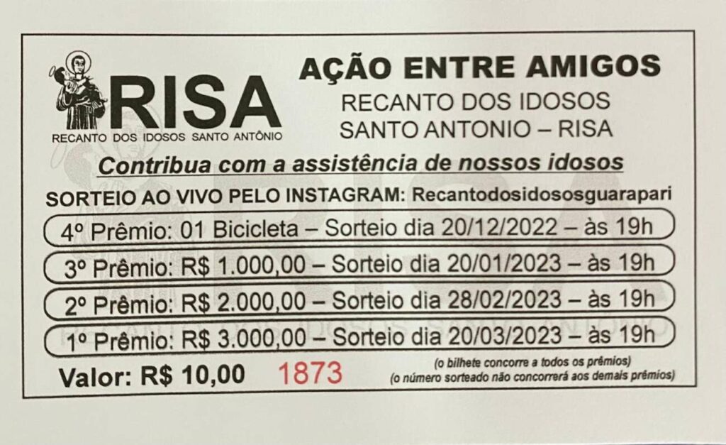 Com o objetivo de arrecadar valores para os custeios com folha salarial, pagamento de décimo terceiro deste ano, e necessidades em geral, como relatou Emanuelly Simões, nutricionista da Instituição, o RISA está promovendo uma Ação entre Amigos com compra de rifas, no valor de R$ 10,00, e sorteio de prêmios em dinheiro.