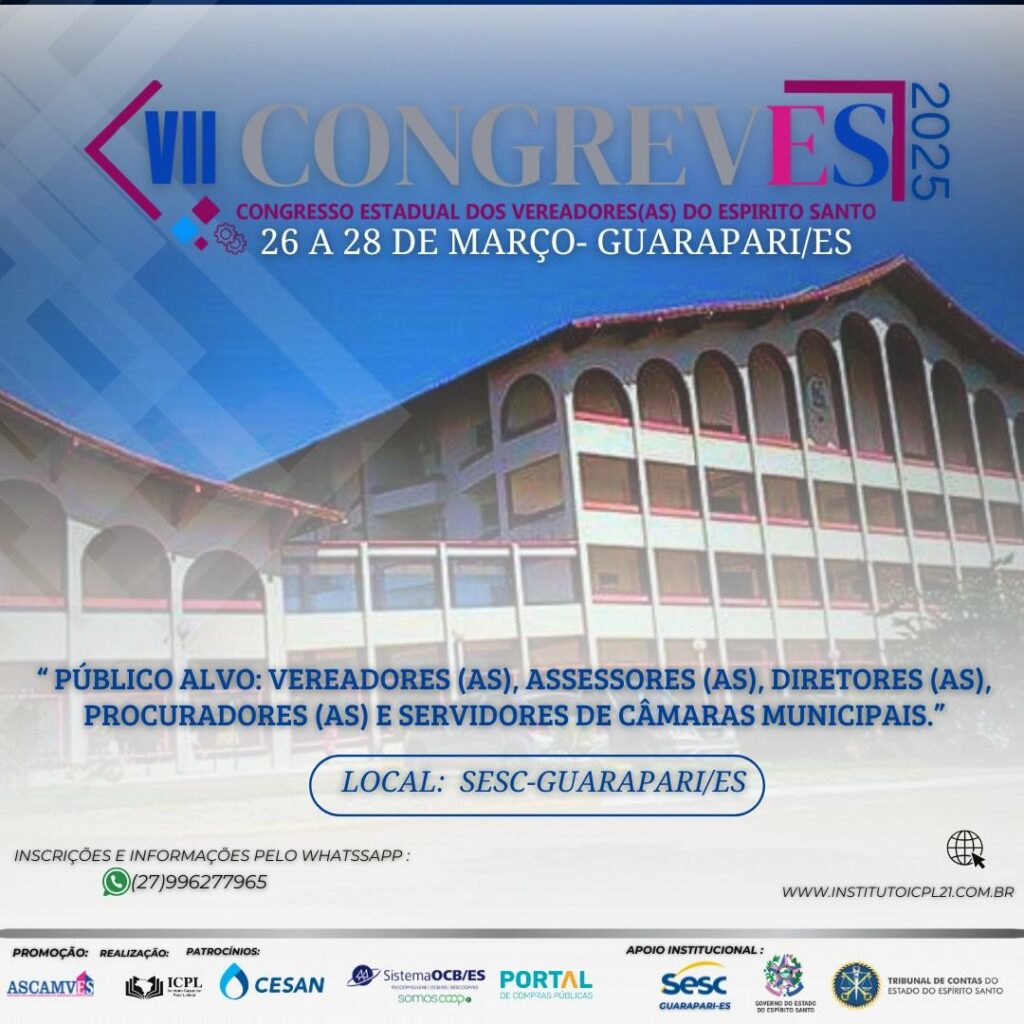 Entre os dias 26 e 28 de março, Guarapari sediará do VII Congresso Estadual dos Vereadores do Espírito Santo (Congreves). O evento, realizado pela Associação das Câmaras Municipais e de Vereadores do Espírito Santo (Ascamves), reunirá autoridades no Sesc de Guarapari para debater temas sobre atuação legislativa e gestão pública. Entre os palestrantes está o prefeito de Vila Velha, Arnaldinho Borgo, que ministrará a palestra “A relação harmônica dos poderes para o bem-estar da população”, nesta quarta-feira (26), às 9h.