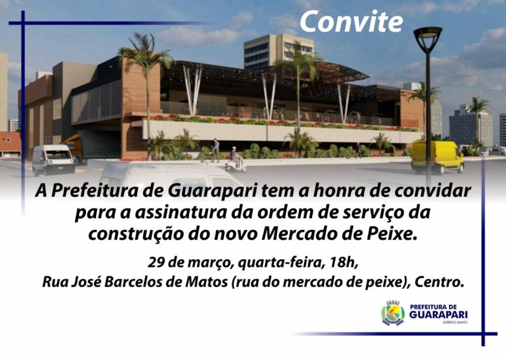 A Prefeitura de Guarapari, através da Secretaria Municipal de Obras (Semop), vai realizar na próxima quarta-feira (29), às 18h, a Cerimônia de Assinatura da Ordem de Serviço, para a construção do Novo Mercado Municipal de Peixe de Guarapari.
