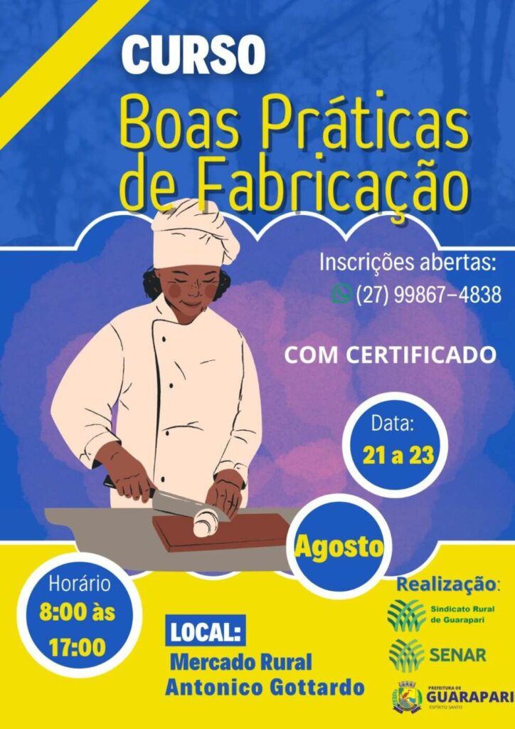 A Prefeitura de Guarapari, através da Secretaria de Meio Ambiente e Agricultura (Semag), está com inscrições abertas para o curso de “Boas Práticas de Fabricação”. O curso, que é direcionado especificamente para agroindústrias e feirantes envolvidos na manipulação de alimentos, além dos setores de fast food e carnes, irá ocorrer entre os dias 21 e 23 de agosto, das 08h às 17h, no Mercado do Produtor Rural.