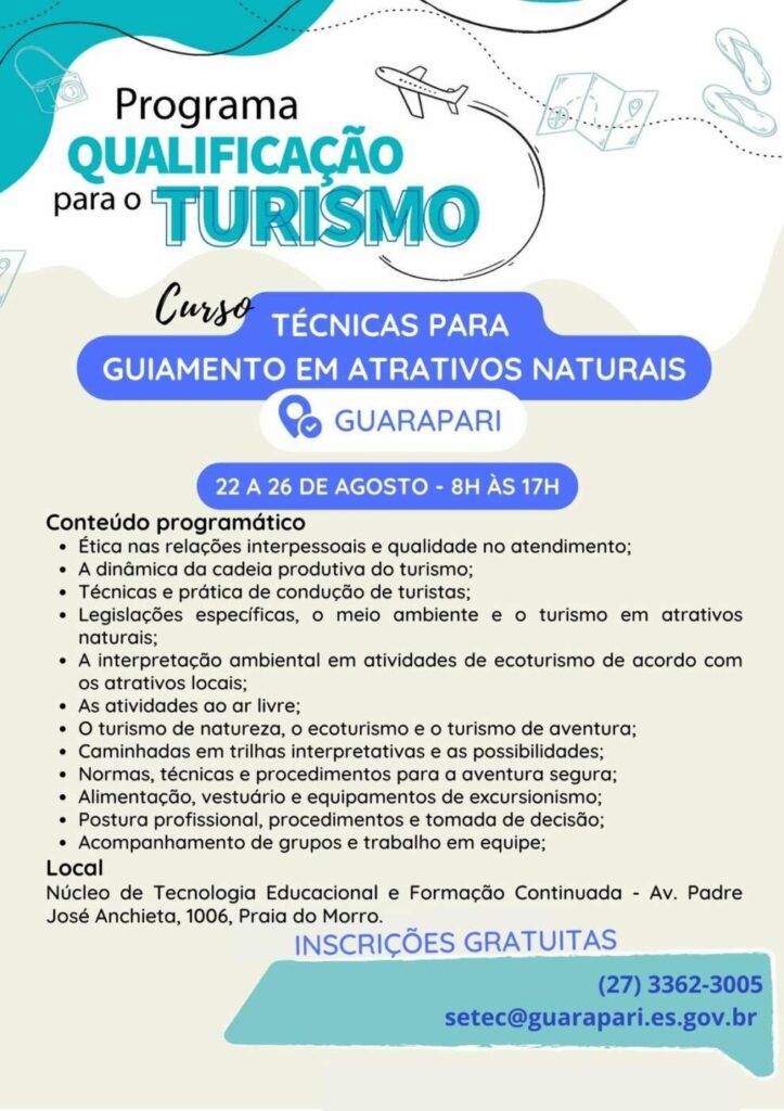A Prefeitura de Guarapari, através da Secretaria de Empreendedorismo, Turismo e Cultura (Setec), em parceria com a Secretaria de Estado do Turismo (Setur), sediará de 22 a 26 de agosto, o Curso de Técnicas para Guiamento em Atrativos Naturais, ministrado por um instrutor do Senac.