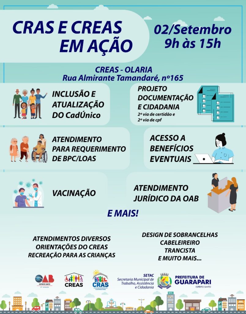 A Prefeitura de Guarapari realiza na próxima sexta-feira (02) uma ação social que ofertará diversos serviços à população, através da Secretaria de Trabalho, Assistência e Cidadania (Setac). A ação ocorre a partir das 9h e 16h, no CREAS, no bairro Olaria.