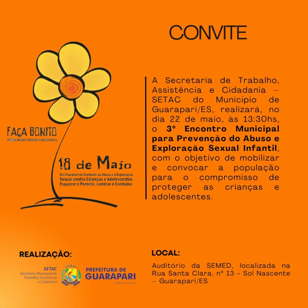 O auditório da Secretaria de Educação de Guarapari, no bairro Sol Nascente, recebe na próxima quarta-feira (22), às 13h30, o 3º Encontro Municipal para Prevenção do Abuso e Exploração Sexual Infantil. O evento ocorre em alusão ao Dia Nacional de Combate ao Abuso e a Exploração Sexual Infantil, no último dia 18.