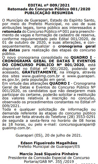 De acordo com a publicação no Diário Oficial, o cronograma estaria disponível no site da Prefeitura de Guarapari e no site da banca responsável pela realização do curso. Entretanto, até o momento do fechamento desta matéria, o cronograma atualizado ainda não foi disponibilizado nos endereços citados.