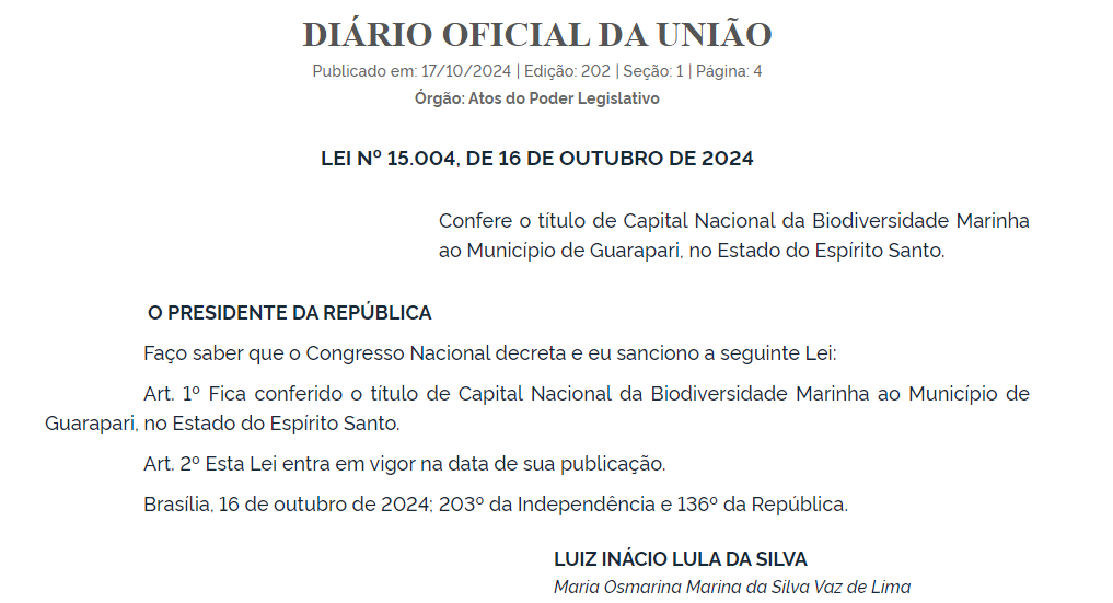 O presidente Luiz Inácio Lula da Silva sancionou o projeto de lei que confere a Guarapari o título de Capital Nacional da Biodiversidade Marinha. A medida foi publicada na edição desta quinta-feira (17) do Diário Oficial da União.