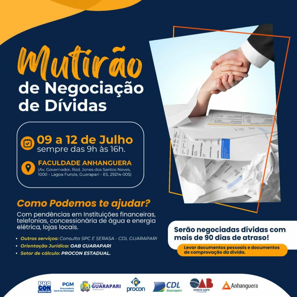 O Procon de Guarapari, órgão de Proteção e Defesa do Consumidor, realizará nos dias 09, 10, 11 e 12 de julho, das 09h às 16h, mais um Mutirão de Negociação de Dívidas. A ação irá ocorrer na sede da Faculdade Anhanguera, no bairro Lagoa Funda.