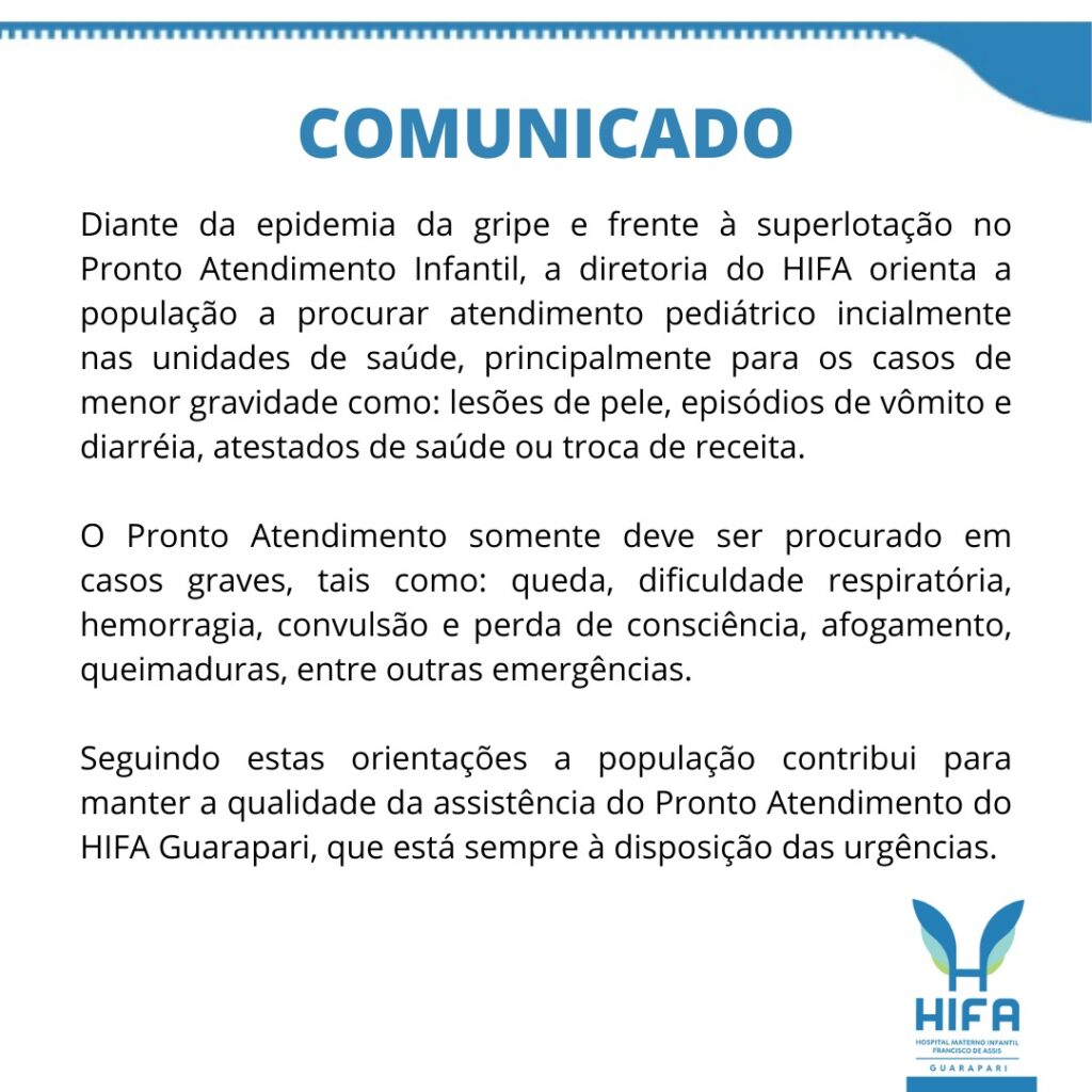 Com uma média diária atual de 140 atendimentos, o Hospital Materno Infantil Francisco de Assis (Hifa Guarapari) registrou, somente na data de ontem (27), 204 pacientes recebidos no pronto atendimento pediátrico. De acordo com os dados, o número total de atendimentos no mês de dezembro já é 20% maior do que o realizado no mês anterior. Diante da alta demanda, a instituição divulgou um comunicado com o objetivo manter a qualidade dos serviços.