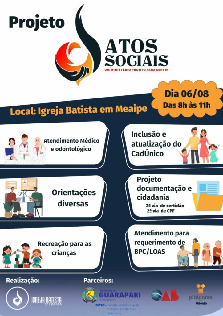 Uma ação social acontecerá nesse sábado (06) em Meaípe, Guarapari. O projeto realizado pela Igreja Batista trará gratuitamente profissionais médicos, enfermeiros, advogados, fisioterapeutas, dentistas e psicólogos para atendimento à população. No local, entre 8h e 11h da manhã, será possível realizar consultas e retirar as segundas vias da identidade e do CPF, além de área de recreação para crianças.
