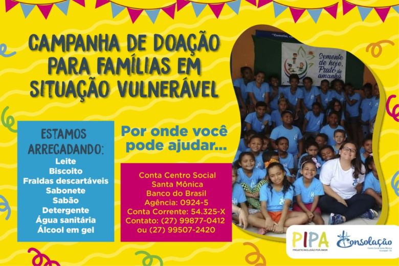 Diante da situação de dificuldade que vivem muitas famílias de Guarapari, o Projeto PIPA, que existe há cerca de quatro anos, está mobilizando doações em uma campanha para ajudar o Centro Social Santa Mônica, que fica no bairro Bela Vista. O objetivo é atender as famílias das crianças assistidas pela instituição.