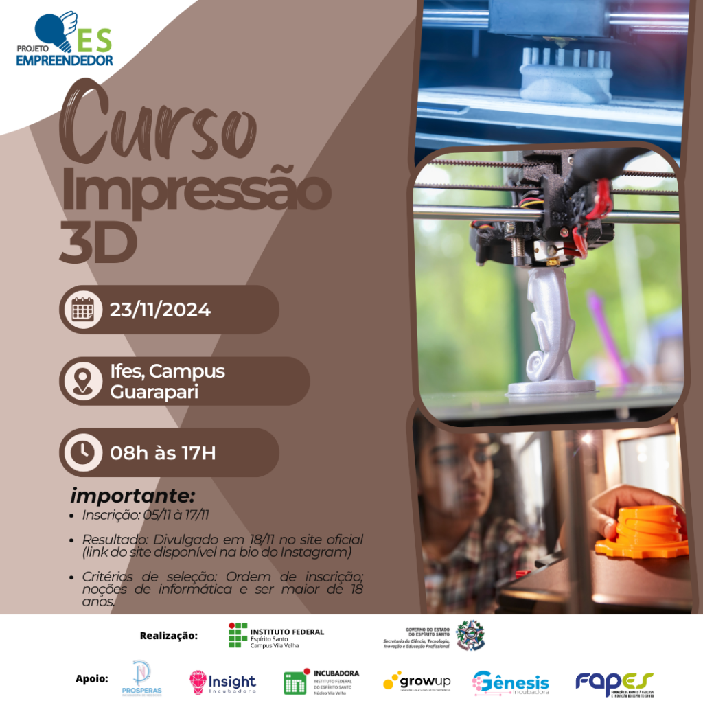 A Incubadora do Instituto Federal do Espírito Santo (Ifes) – Campus Guarapari, em parceria com a Incubadora de Vila Velha, vai oferecer gratuitamente o curso de Impressão 3D, como parte do Projeto ES Empreendedor. A iniciativa visa capacitar profissionais e empreendedores, proporcionando uma oportunidade de aprender e aplicar a tecnologia de impressão tridimensional.