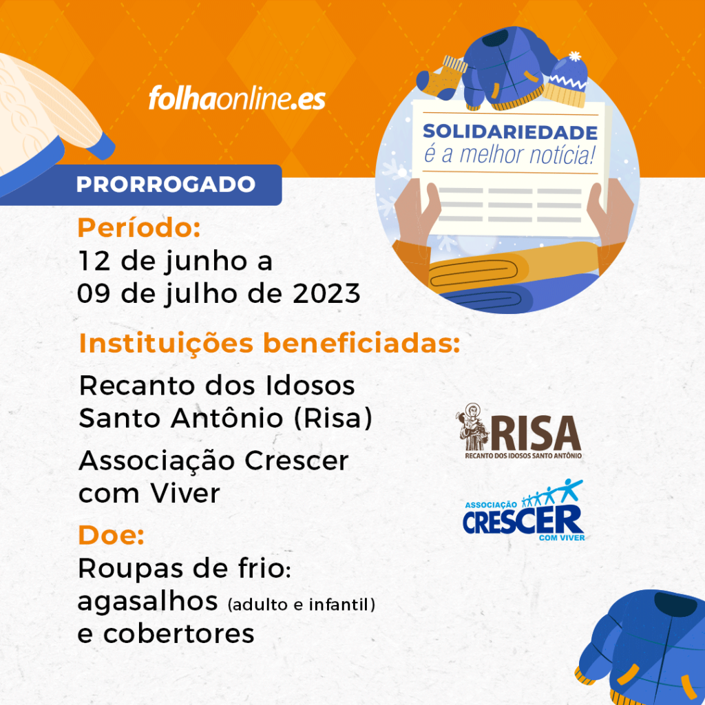 O folhaonline.es, veículo ancorado pela HM Comunicação, prorrogou a campanha “Solidariedade é a melhor notícia!”. O objetivo é arrecadar roupas de frio: agasalhos (adulto e infantil) e cobertores para serem doados ao Recanto dos Idosos Santo Antônio (Risa) e à Associação Crescer com Viver.