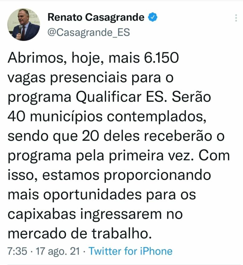 O governador do Espírito Santo divulgou nesta manhã (17), através de uma rede social, a abertura das novas vagas para os cursos do Qualificar ES em todo Estado. Na publicação, Casagrande anunciou que mais 6.150 vagas presenciais foram abertas, inclusive pela primeira vez em alguns municípios capixabas.