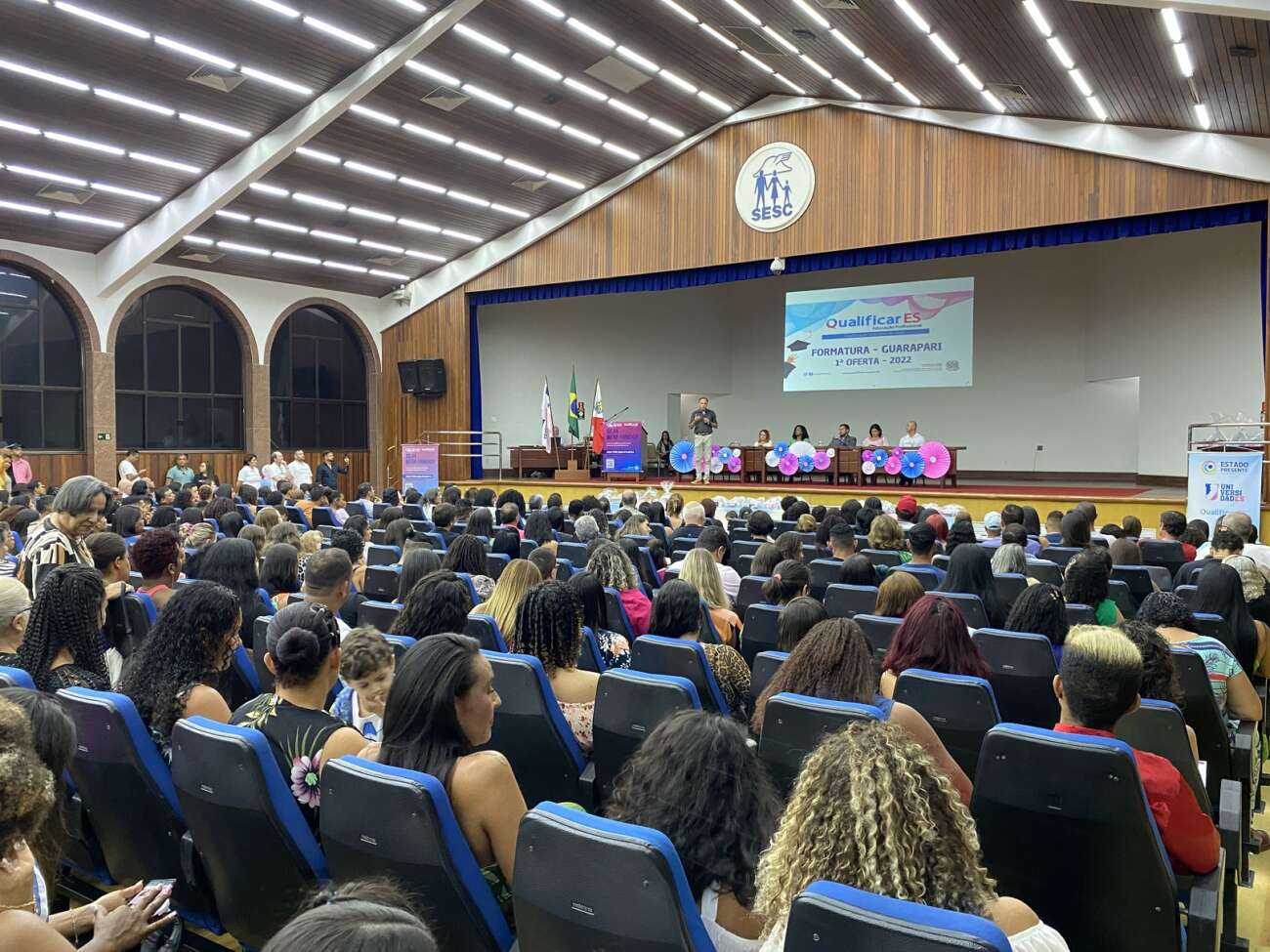 Na noite desta quinta-feira (02), aconteceu a formatura da primeira oferta presencial de 2022 do programa Qualificar ES em Guarapari. Ao todo, a oferta contemplou 624 vagas distribuídas em 26 cursos de diferentes áreas, distribuídas nos nove polos do programa nas regiões de Guarapari. O evento aconteceu no Sesc de Guarapari e contou com a participação dos formandos, familiares e lideranças políticas locais e do Espírito Santo.
