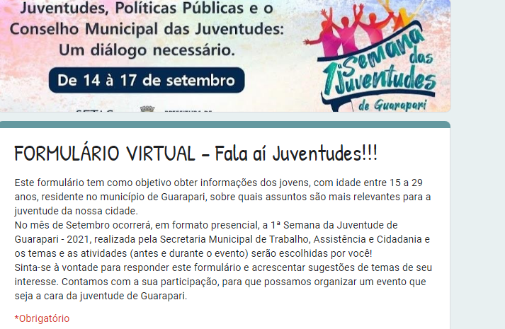 De acordo com a Secretaria Municipal de Trabalho, Assistência e Cidadania (Setac) o formulário foi elaborado para identificar o perfil dos jovens de Guarapari e a partir disso, pensar com eles a programação para a Semana das Juventudes de Guarapari.
