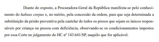 De acordo com o documento, o habeas corpus coletivo com pedido de liminar pede que se estenda a TODAS AS PESSOAS, únicas e exclusivamente responsáveis por crianças e deficientes, o mesmo que estipulou a substituição da prisão preventiva por domiciliar para mulheres presas provisoriamente, em todo o território nacional, que eram ou são gestantes, ou mães de crianças de até 12 anos ou de pessoas com deficiência em qualquer idade, desde que não tenham cometido crime contra o próprio filho ou com uso de violência.