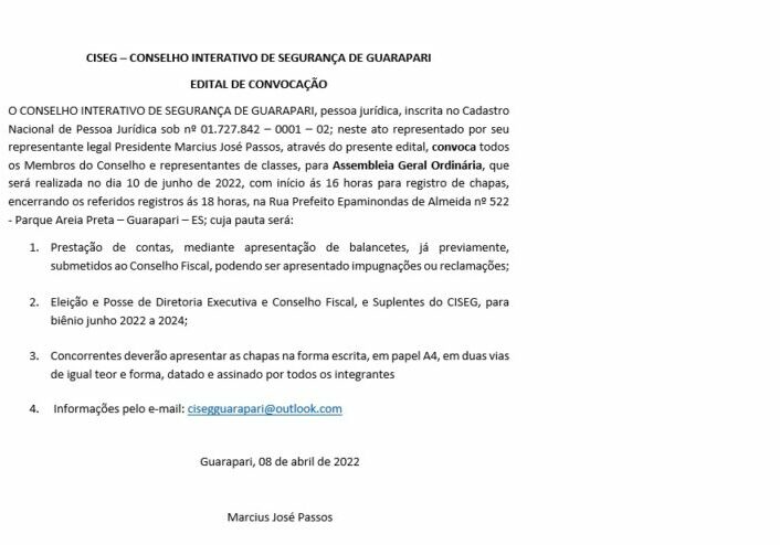 EDITAL DE CONVOCAÇÃO – CISEG – CONSELHO INTERATIVO DE SEGURANÇA DE GUARAPARI