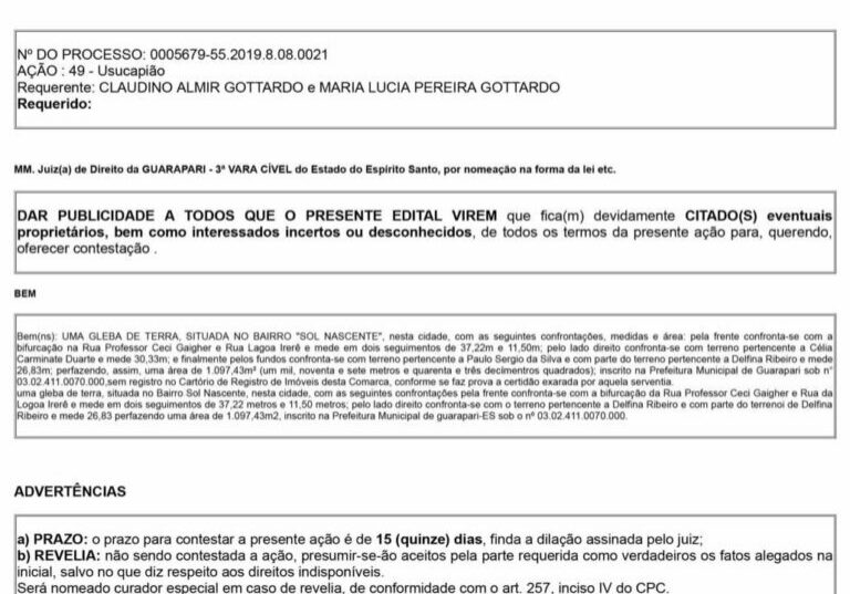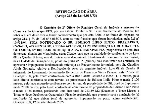 GLAUBER GOTARDO – EDITAL DE NOTIFICAÇÃO – RETIFICAÇÃO DE ÁREA