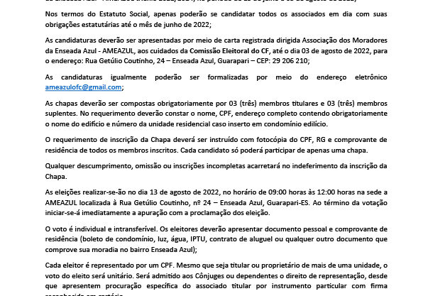 AMEAZUL – EDITAL DE CONVOCAÇÃO DE ELEIÇÃO PARA O CONSELHO FISCAL TRIÊNIO 2022/2024