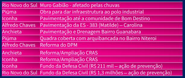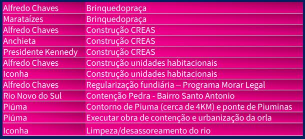 O governador Renato Casagrande também apresentou para as lideranças presentes um quadro de investimentos futuros a serem realizados nos municípios. Confira abaixo.