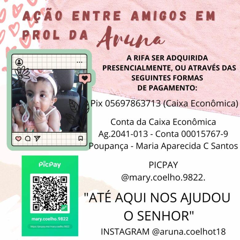 Atualmente, o pai de Aruna trabalha enquanto a mãe se dedica integralmente aos cuidados da filha. “O que meu marido ganha consegue manter os custos para nós dois, mas não é o suficiente para custear o tratamento da Aruna, então alguns amigos sugeriram as rifas e o que conseguimos arrecadar é tudo direcionado para o tratamento da nossa filha”, contou Mary.