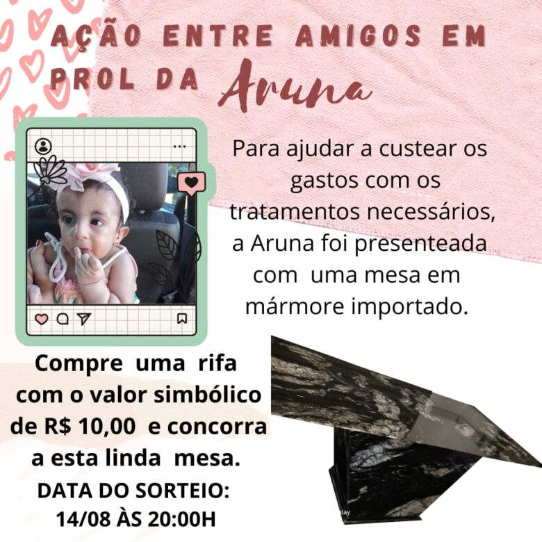 A mesa de mármore foi doação de um casal de amigos da família da Serra para realização da rifa. “Foi uma surpresa quando me mandaram a foto e disseram que seria um presente para a Aruna. É uma mesa muito bonita e dizem ser ainda mais bonita pessoalmente”, comemorou. Atualmente, a mesa está em uma marmoraria na Serra, onde foi confeccionada e a retirada será de responsabilidade do ganhador.